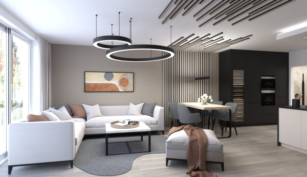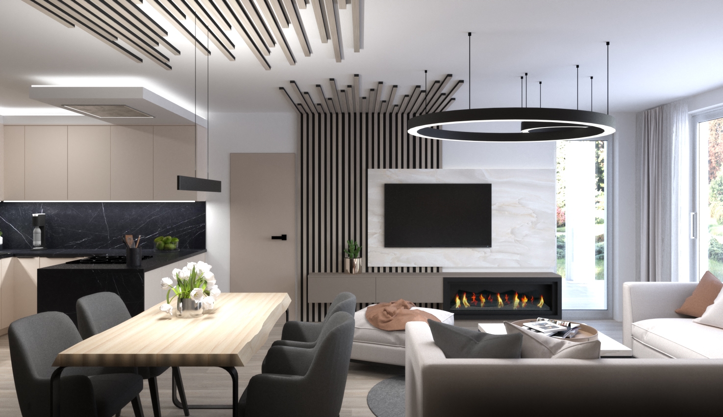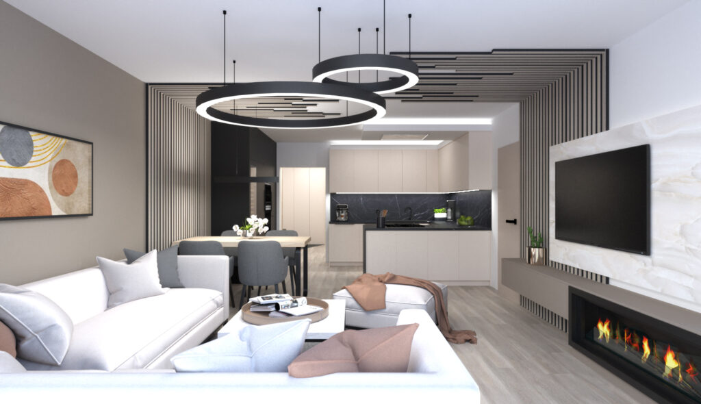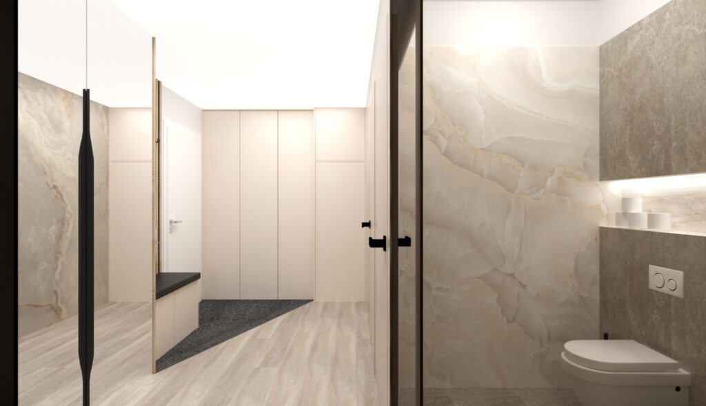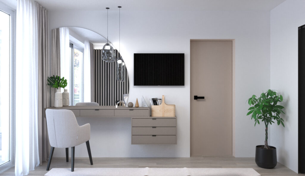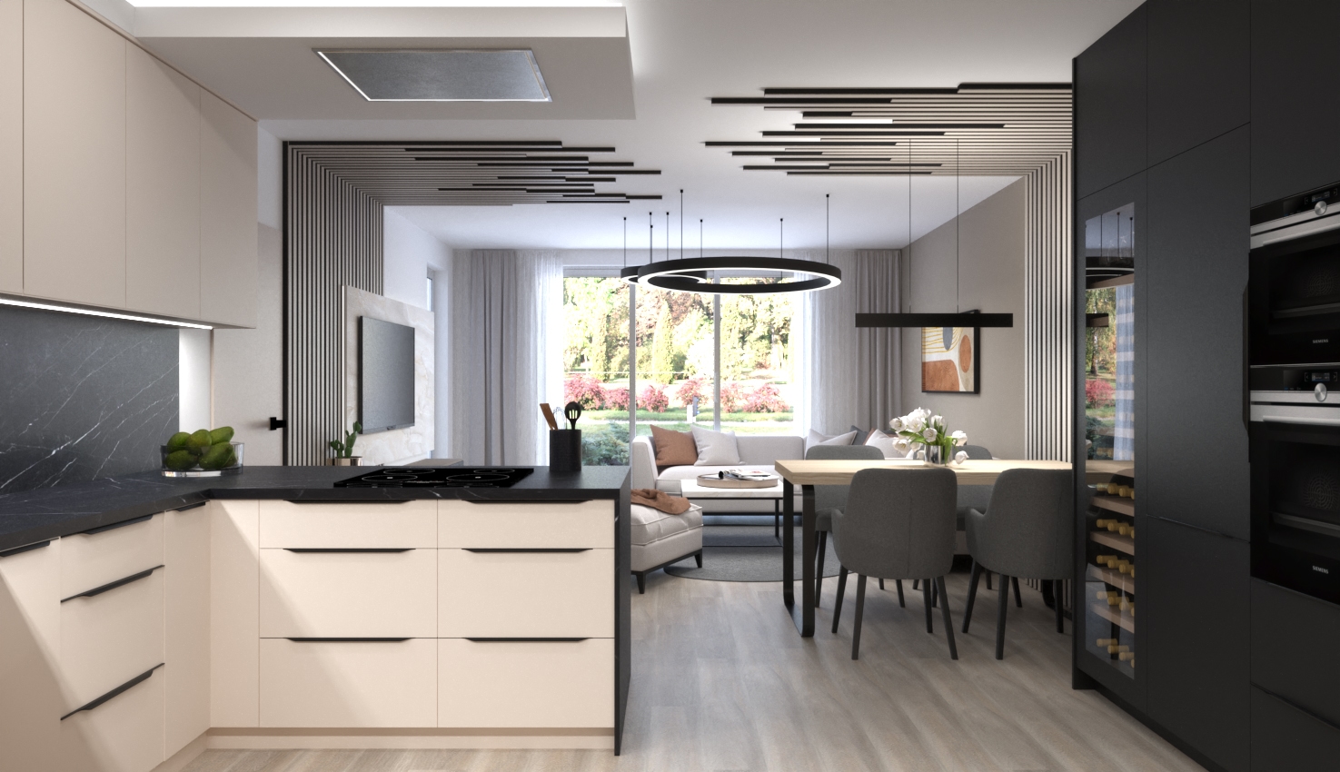Dominantou bytu je otevřený obývací prostor s kuchyní, kde se přirozeně potkává každodenní život s estetikou. Čisté linie, jemné tóny a kontrastní detaily vytváří prostředí, které působí klidně, ale zároveň má charakter.