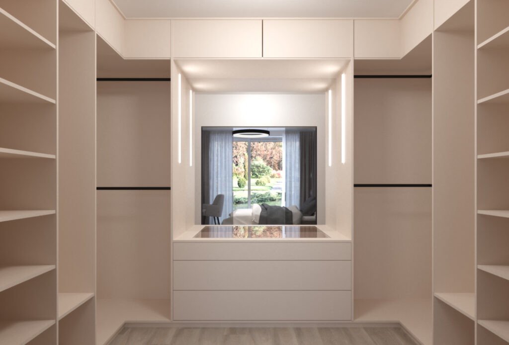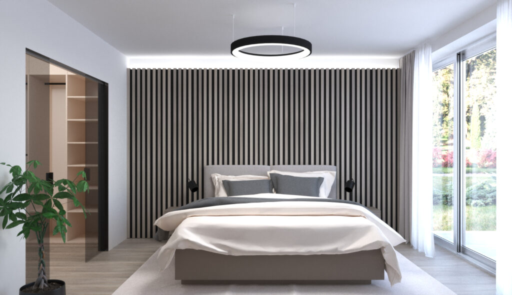 Ložnice nabízí přesně to, co od ní čekáte – klid, soukromí a dostatek místa. Navazující šatna pak řeší věci, které v jiných bytech často chybí. Tady má všechno své místo.